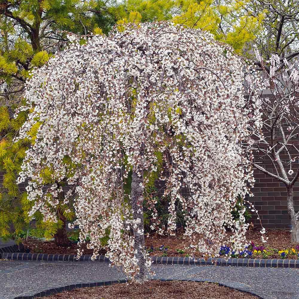 Low maintenance Snow Fountain Weeping Cherry Trees are a favorite among the north and snow because they’re cold hardy and heat resistant. They are cold hardy to zone 5 and will flourish under heavy layers of ice and snow. Your summers will be worry-free while your drought-tolerant Snow Fountain Weeping Cherry Tree flourishes without the need to be constantly checked on.